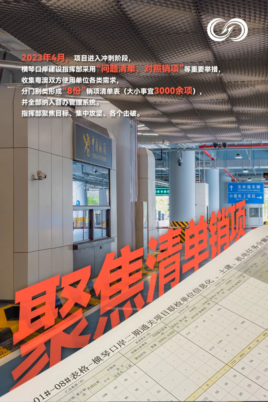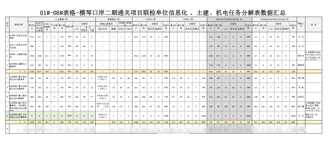 八是清單銷項??诎吨笓]部延續(xù)“5+2”、“白+黑”的工作模式,解決現(xiàn)場推進過程中遇到的實際問題,確保問題不過夜。沖刺階段,更是堅持每天下午17:00組織參建單位召開工作協(xié)調(diào)推進會,重點梳理土建工程、信息化工程剩余工作推進情況、材料設(shè)備到場情況、質(zhì)量問題整改情況等,形成8份銷項表,包括粵方海關(guān)、粵方邊檢、澳方海關(guān)、澳方邊檢、澳方衛(wèi)生局等需協(xié)調(diào)解決的問題,實行“問題清單銷項督辦”的機制,要求各責(zé)任人“鎖定需求、對表作戰(zhàn),對照銷項”。據(jù)統(tǒng)計,梳理大小問題多達3000余項。