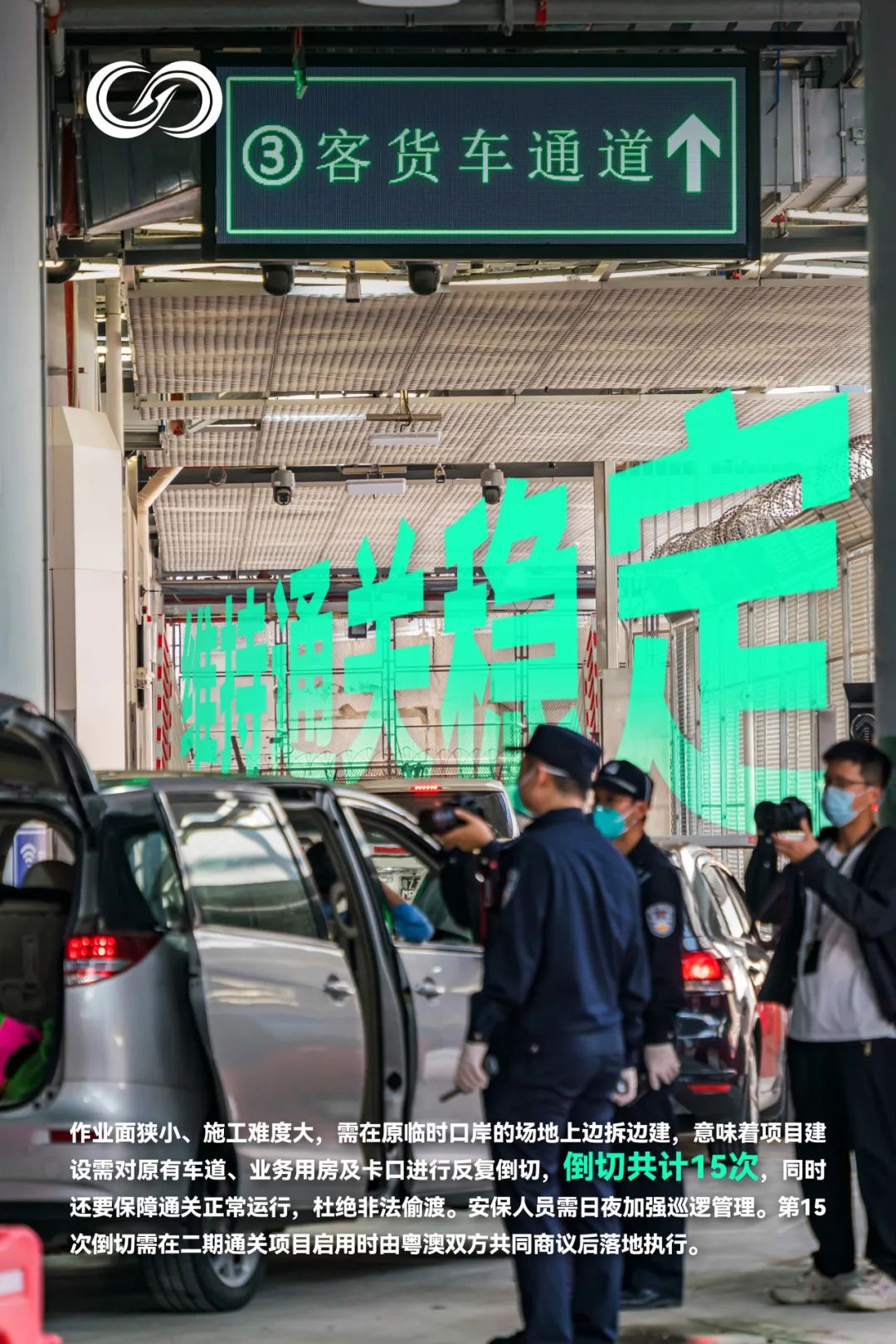 邊騰挪轉(zhuǎn)關(guān)、邊通關(guān)運行的特殊性,意味著項目建設(shè)需對原有車道、業(yè)務(wù)用房及卡口進行反復(fù)倒切。建設(shè)過程中,指揮部保持與粵澳兩地聯(lián)檢單位緊密溝通,根據(jù)工程進展和安全施工的要求對通關(guān)道路多次倒切(共計倒切15次)。為杜絕非法偷渡,指揮部在原有的粵澳分界圍網(wǎng)之外,增設(shè)防攀爬圍網(wǎng),搭載監(jiān)控設(shè)備,安排安保人員日夜巡邏,保障正常通關(guān)及邊境安全。