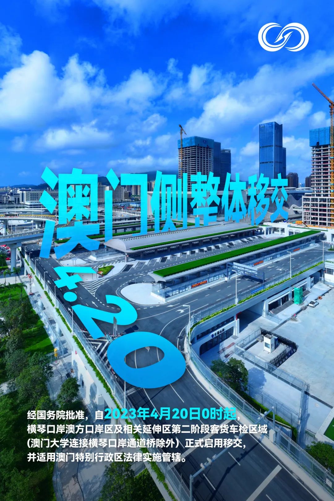 經(jīng)國務(wù)院批準,自2023年4月20日0時起,橫琴口岸澳方口岸區(qū)及相關(guān)延伸區(qū)第二階段客貨車檢區(qū)域(澳門大學(xué)連接橫琴口岸通道橋除外)正式啟用移交,并適用澳門特別行政區(qū)法律實施管轄。