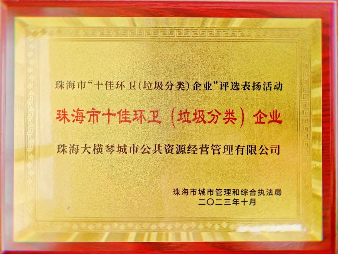 2023年,大橫琴城資榮獲“廣東省清掃、收集、運輸和清潔類環(huán)衛(wèi)服務企業(yè)”一級評定和珠海市“十佳環(huán)衛(wèi)(垃圾分類)企業(yè)”稱號。