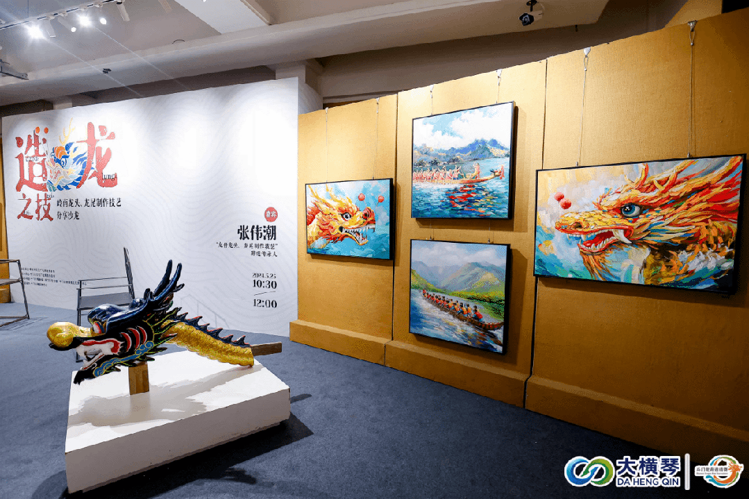 斗門龍舟賽深厚底蘊(yùn),不僅僅是一場水上競渡,更是一系列民俗文化的集大成者。睇龍船、嘆非遺,與比賽同步進(jìn)行的,還有“龍騰黃楊——珠海龍舟民俗文化藝術(shù)展”和傳承人張偉潮分享的“端午龍舟龍頭龍尾制作技藝”沙龍。