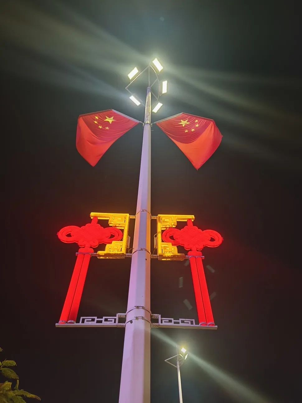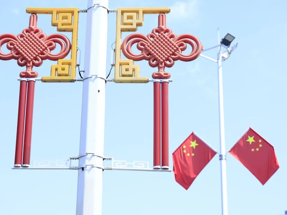 喜慶的中國結與迎風飄揚的五星紅旗交相輝映