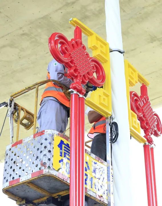 作業(yè)人員在各主干道懸掛中國結