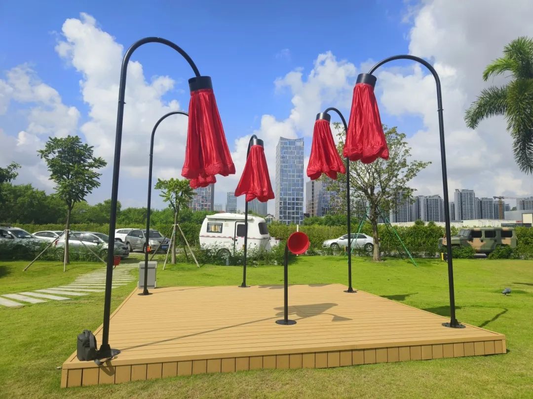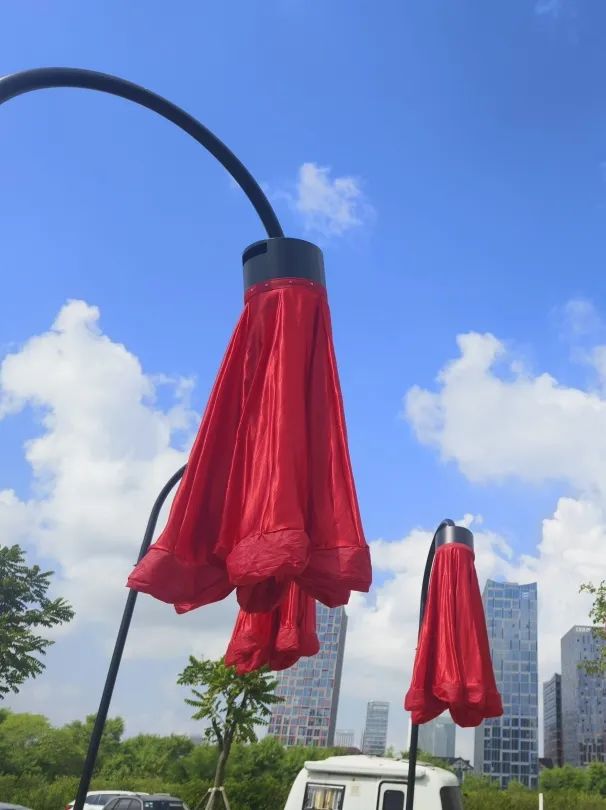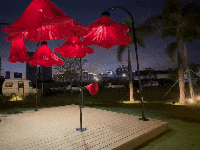 橫琴生態(tài)澤園的創(chuàng)意燈飾以含苞待放的喇叭花為主體造型,花朵使用充氣物料制成,內部藏有感應器。