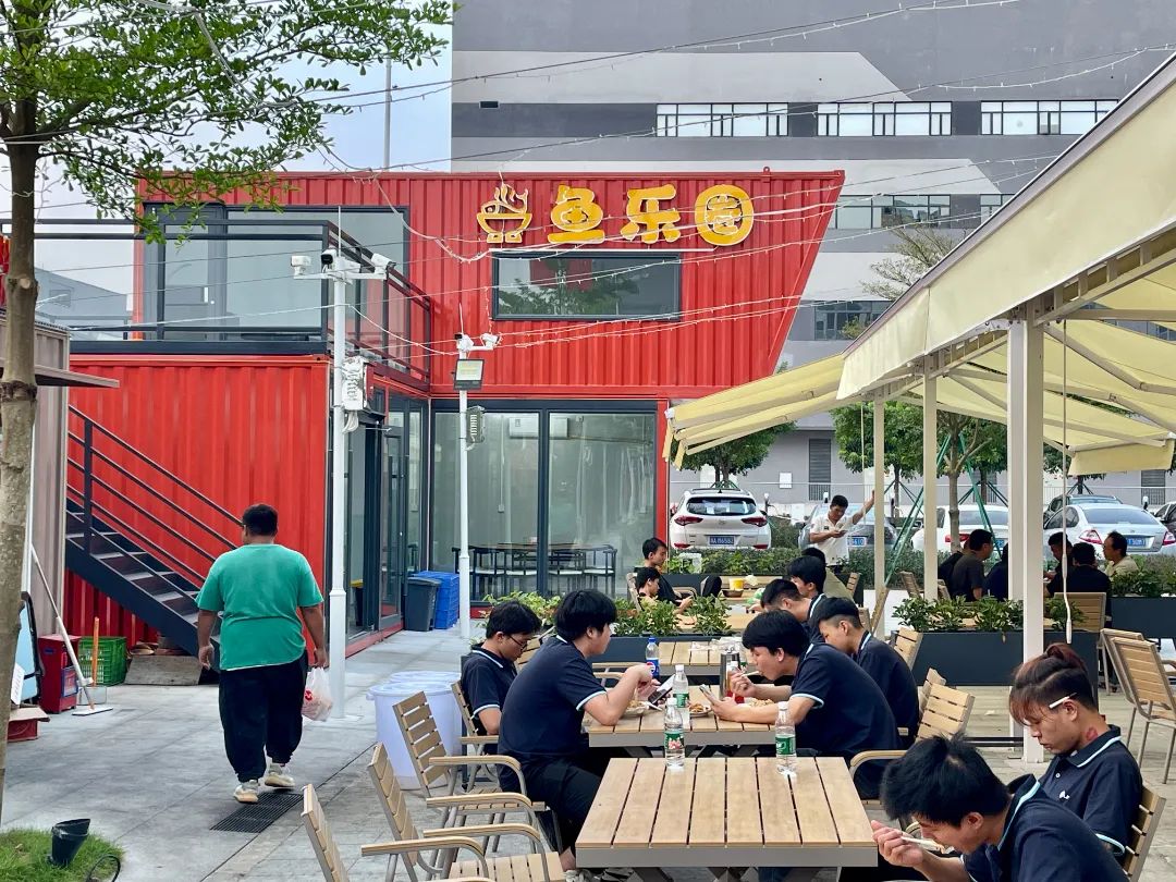 富山街市位于斗門大橫琴5.0產業(yè)新空間,坐落于B區(qū)公服中心西側,占地面積1200㎡,有11個攤位,多個五顏六色的集裝箱錯落有致,儼然是工廠風的商務區(qū)—“廠BD”。