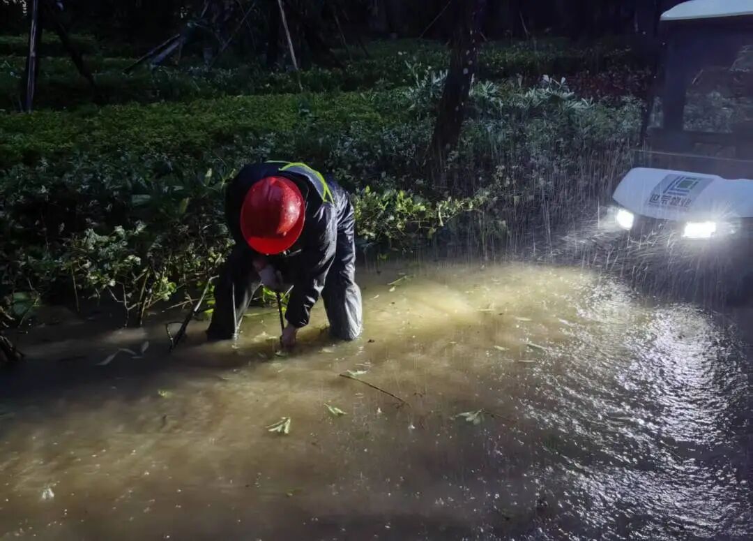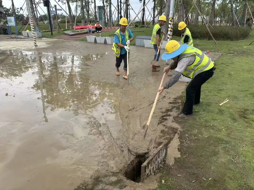 臺風(fēng)期間,受風(fēng)暴潮影響,橫琴天沐河水位上漲,珠光集團(tuán)迅速組織搶險(xiǎn)力量,通過加筑沙袋有效阻止海水倒灌進(jìn)天沐河,同步安全轉(zhuǎn)移設(shè)備設(shè)施,并緊急安裝抽水設(shè)備清理積水,避免變電房被水浸泡。臺風(fēng)過境后,搶險(xiǎn)隊(duì)伍立即投入后續(xù)清理工作,第一時(shí)間清理泵站進(jìn)水口垃圾,保障泵站排水通暢,降低村渠水位;清理排水口垃圾,保障土渠排水暢通;并全力協(xié)助合作區(qū)市政管理署,清理倒塌的邊境圍網(wǎng)。